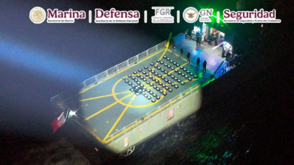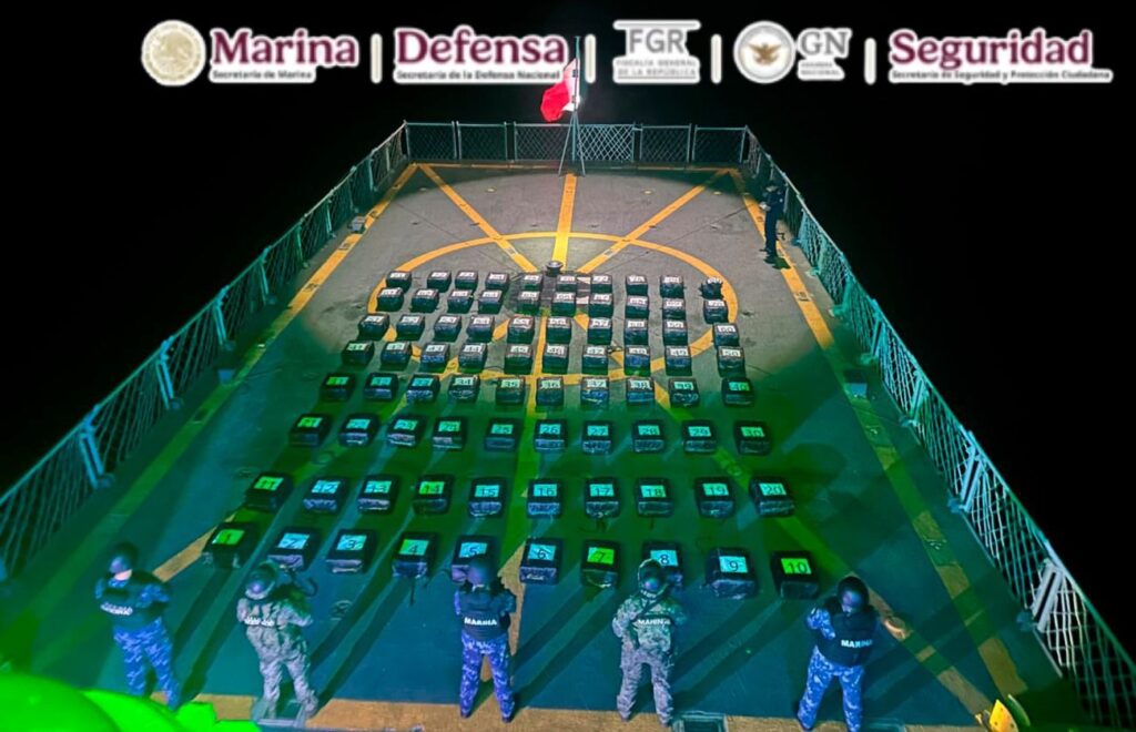 En una operación marítima encabezada por elementos de la Secretaría de Marina (Semar), a través de la Armada de México en funciones de Guardia Costera, en coordinación con la Fiscalía General de la República (FGR) y la Secretaría de Seguridad y Protección Ciudadana (SSPC), se aseguraron 80 bultos con aproximadamente dos toneladas de presunta cocaína, cuyo peso exacto será determinado por las autoridades ministeriales correspondientes.